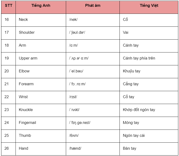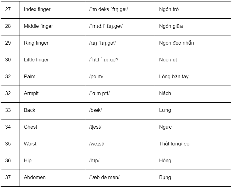 2. Từ vựng tiếng Anh nói về cơ thể người: Phần thân trên