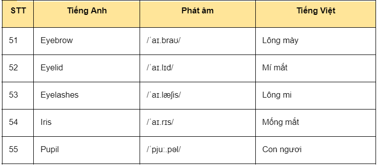 4. Từ vựng tiếng Anh về cơ thể người: Bộ phận mắt