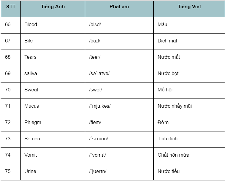 6. Từ vựng về tiếng Anh về chất lỏng trong cơ thể