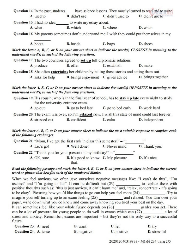 => Cần phải đọc toàn bộ đoạn văn và chọn câu trả lời đúng từ các gợi ý A, B, C, D. Những câu trả lời này liên quan đến các mảng kiến thức như nghĩa và cách sử dụng danh từ, động từ, giới từ, tính từ thông dụng, cấu trúc câu hoặc đại từ quan hệ.