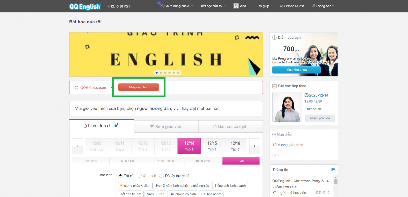 - Nếu nút Nhập lớp học không xuất hiện sau thời gian đã lên lịch, vui lòng tải lại trang Bài học của tôi. Nếu không xuất hiện ngay cả sau khi tải lại, hãy nhập và bài học liên quan từ “Lịch đặt chỗ” trên trang Bài học của tôi và nút “Nhập lớp học” sẽ xuất hiện để bạn có thể tham gia lớp học từ đó.